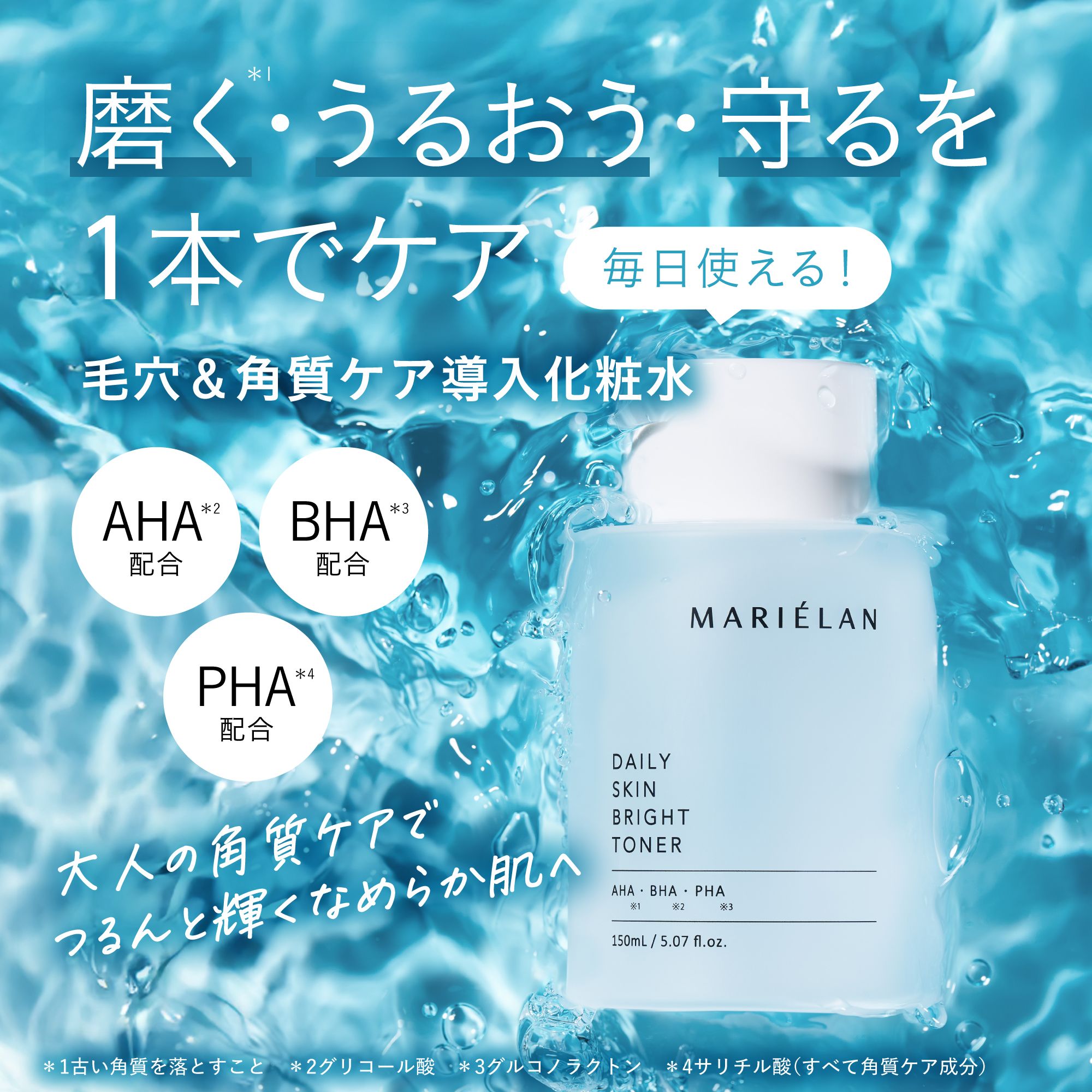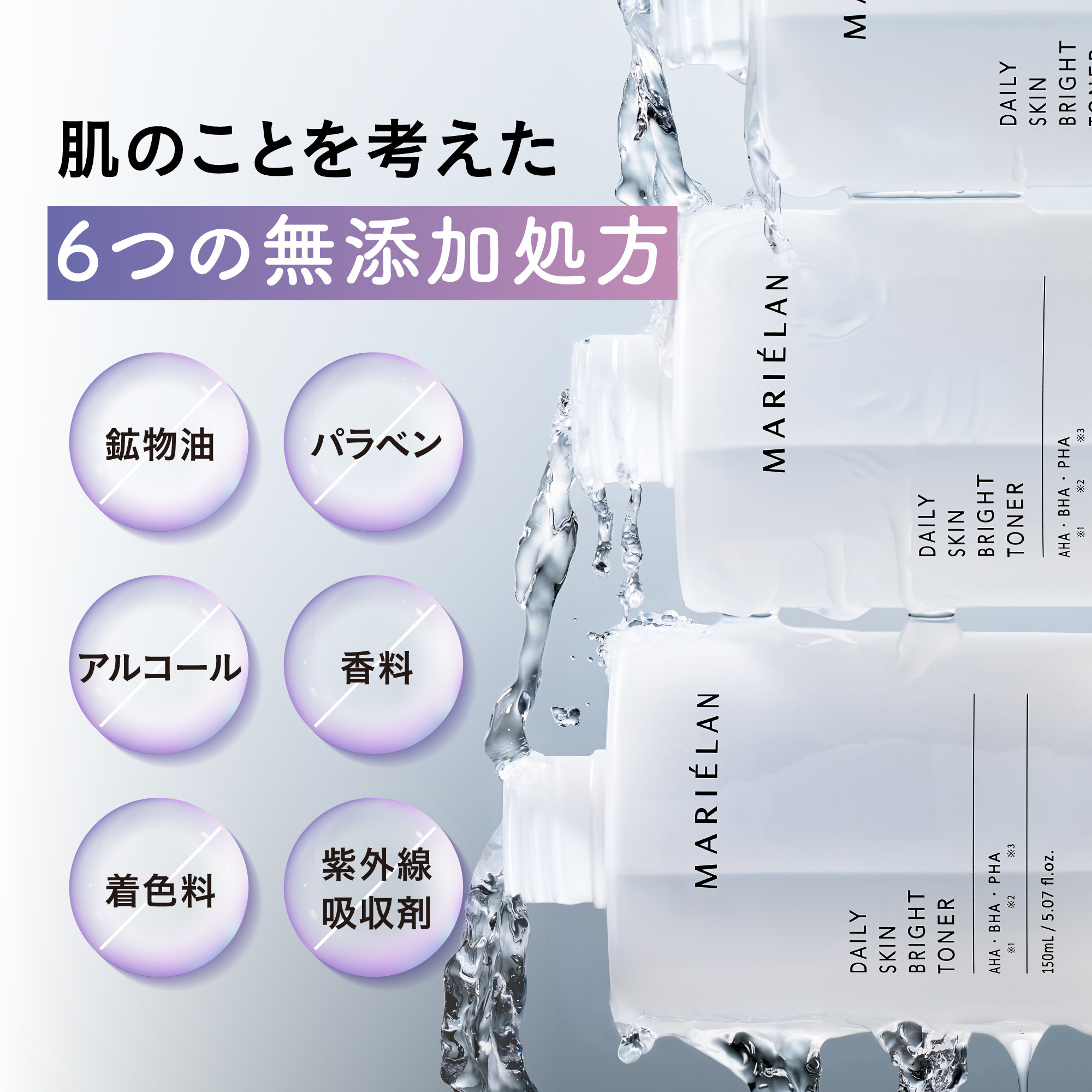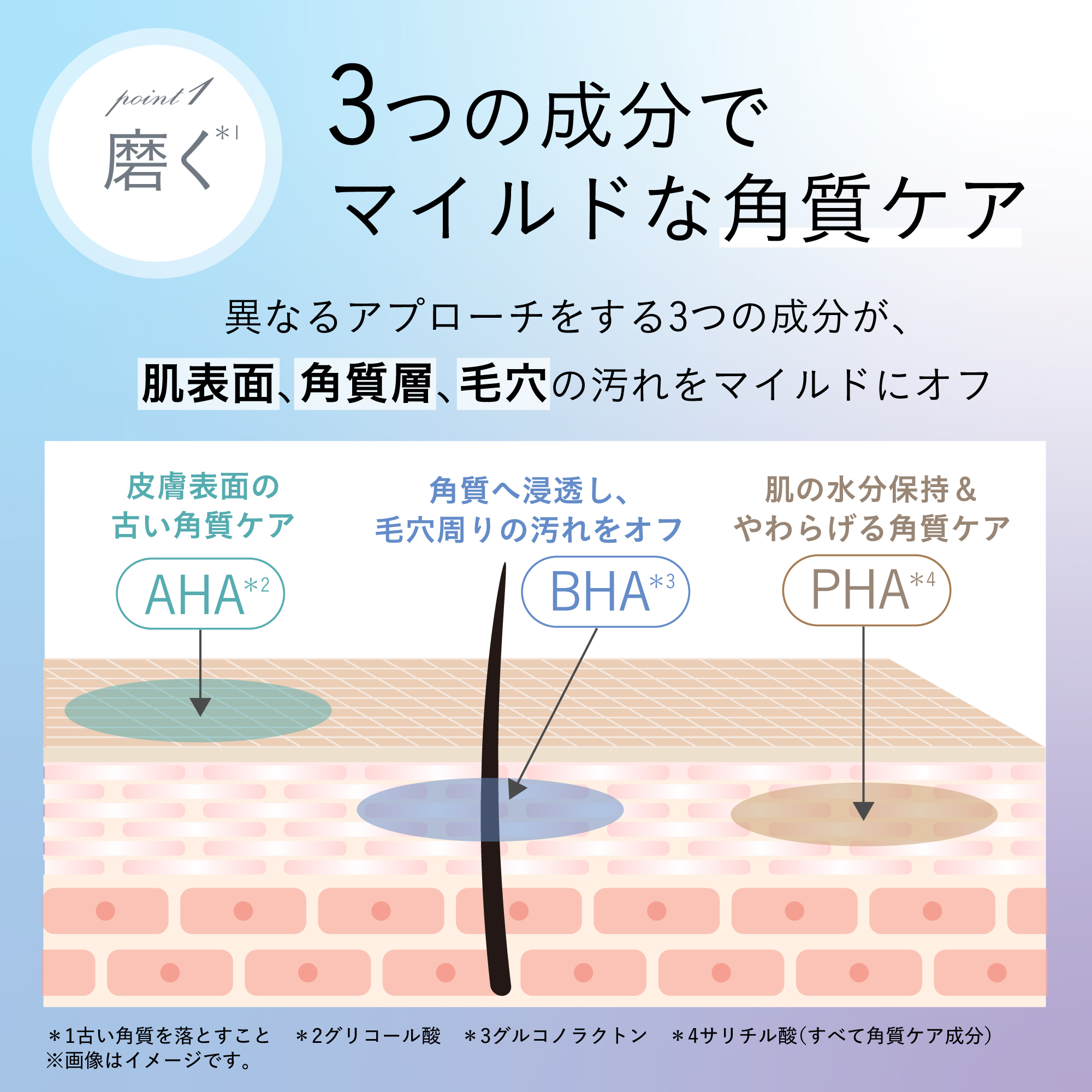 この化粧水は一般的なピーリングや拭き取り化粧水とは違い、角質ケアが苦手な方でも、無理なく続けられるように【やさしく磨いて、しっかり守る】ことを大切にしています。