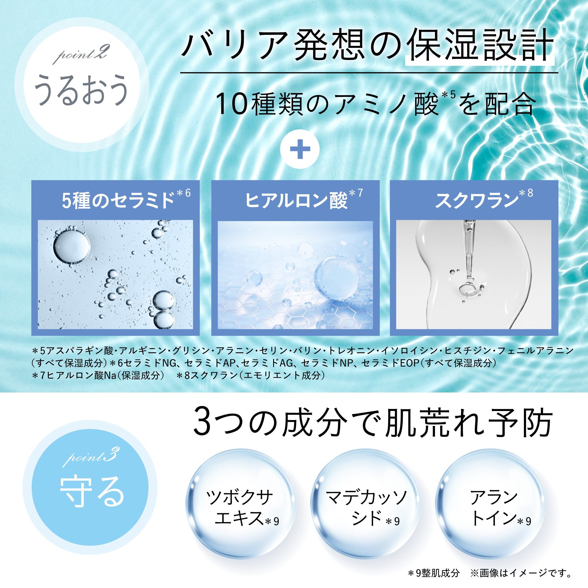 やさしいとろみのあるテクスチャーが、みずみずしく素肌になじみ、角質層のすみずみまでうるおいで満たします。