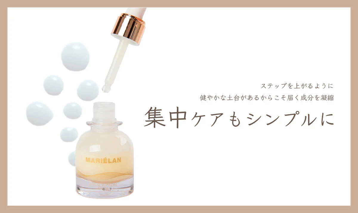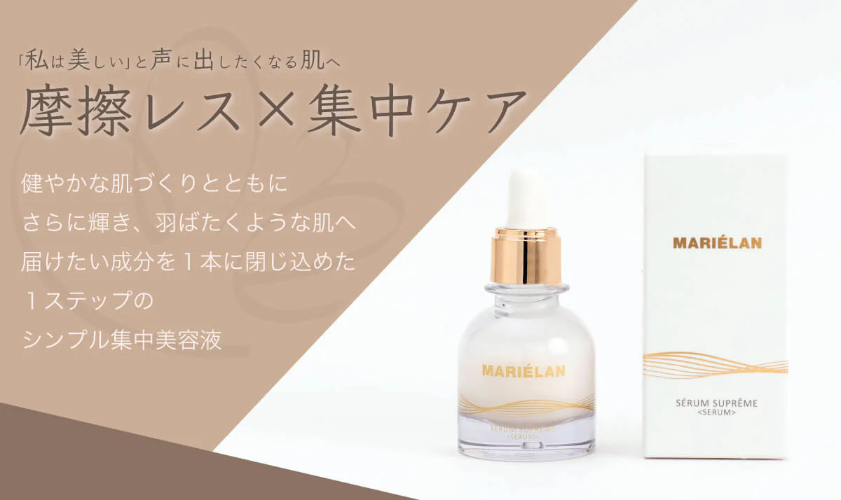 MARIÉLANの美容理論である「摩擦レス」「保湿」にこだわった美容液。研究目線で厳選した成分x自然の力が凝縮した和漢成分をベースに、酸化されにくく安定性の高い保湿成分「スクワラン」を配合することで、贅沢な美容成分※6がお肌のすみずみまで浸透※10し、なめらかにお肌になじみます。