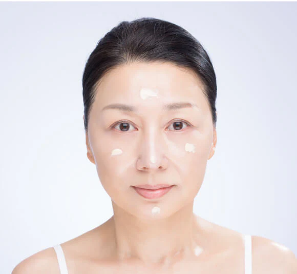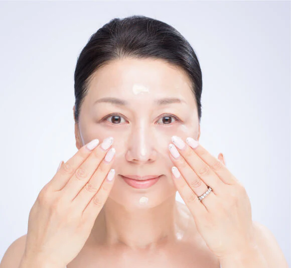 顔の中心から外側に向かって、やさしくムラなく少しずつぬりのばします。